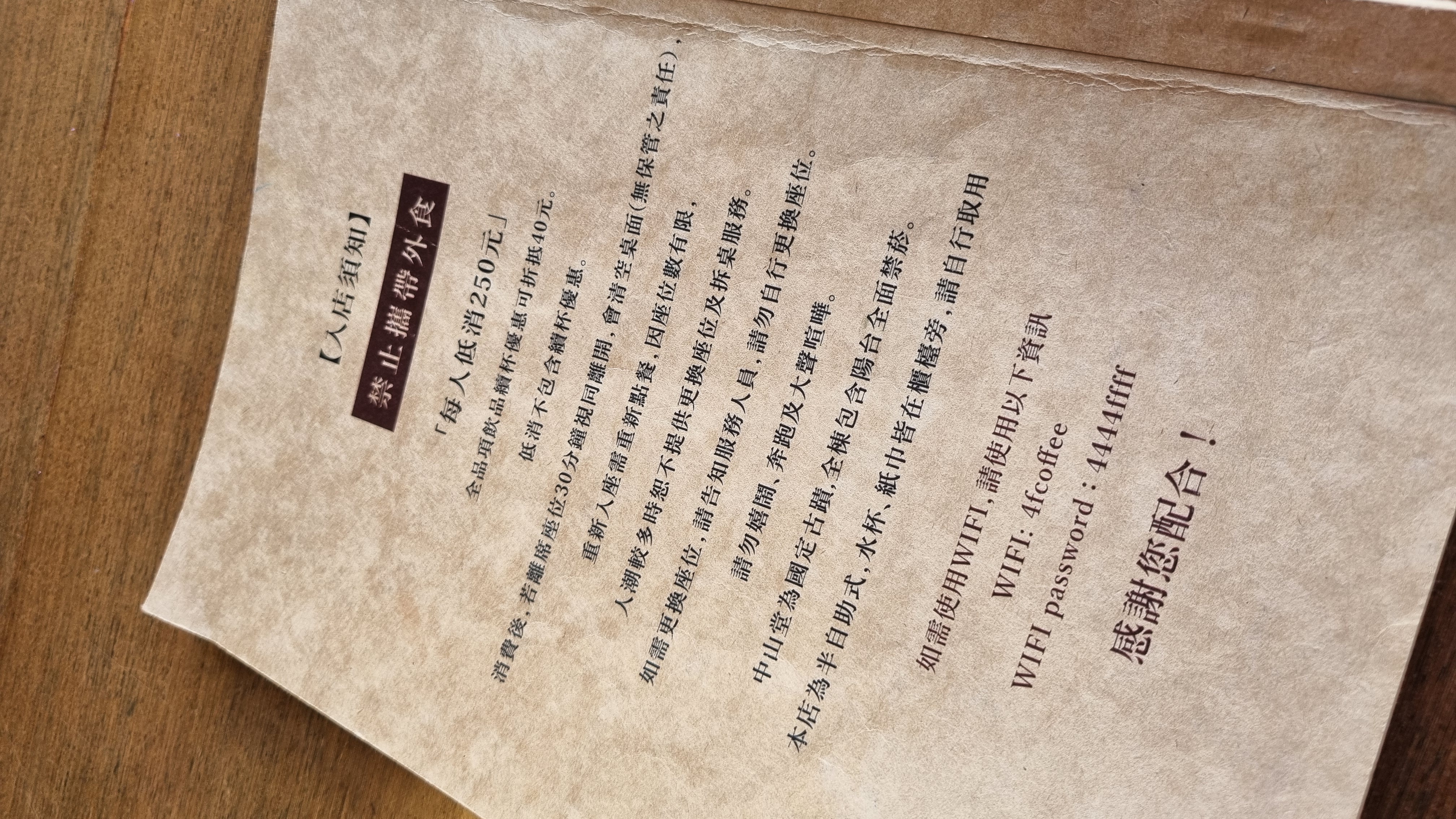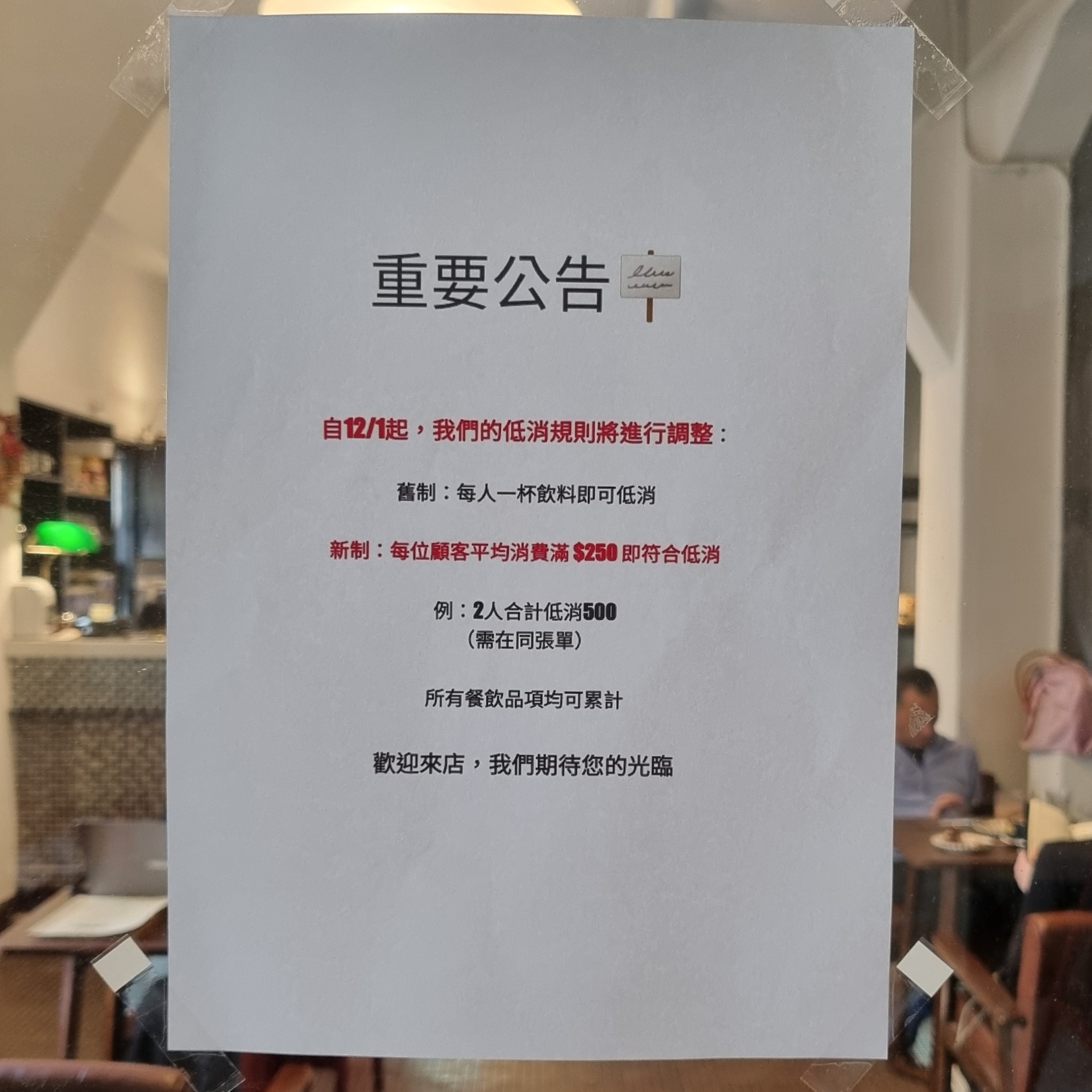 1인당 최소 250 NTD를 주문하라는 것으로 변경되었다는 걸 알리는 문구가 붙어있다.