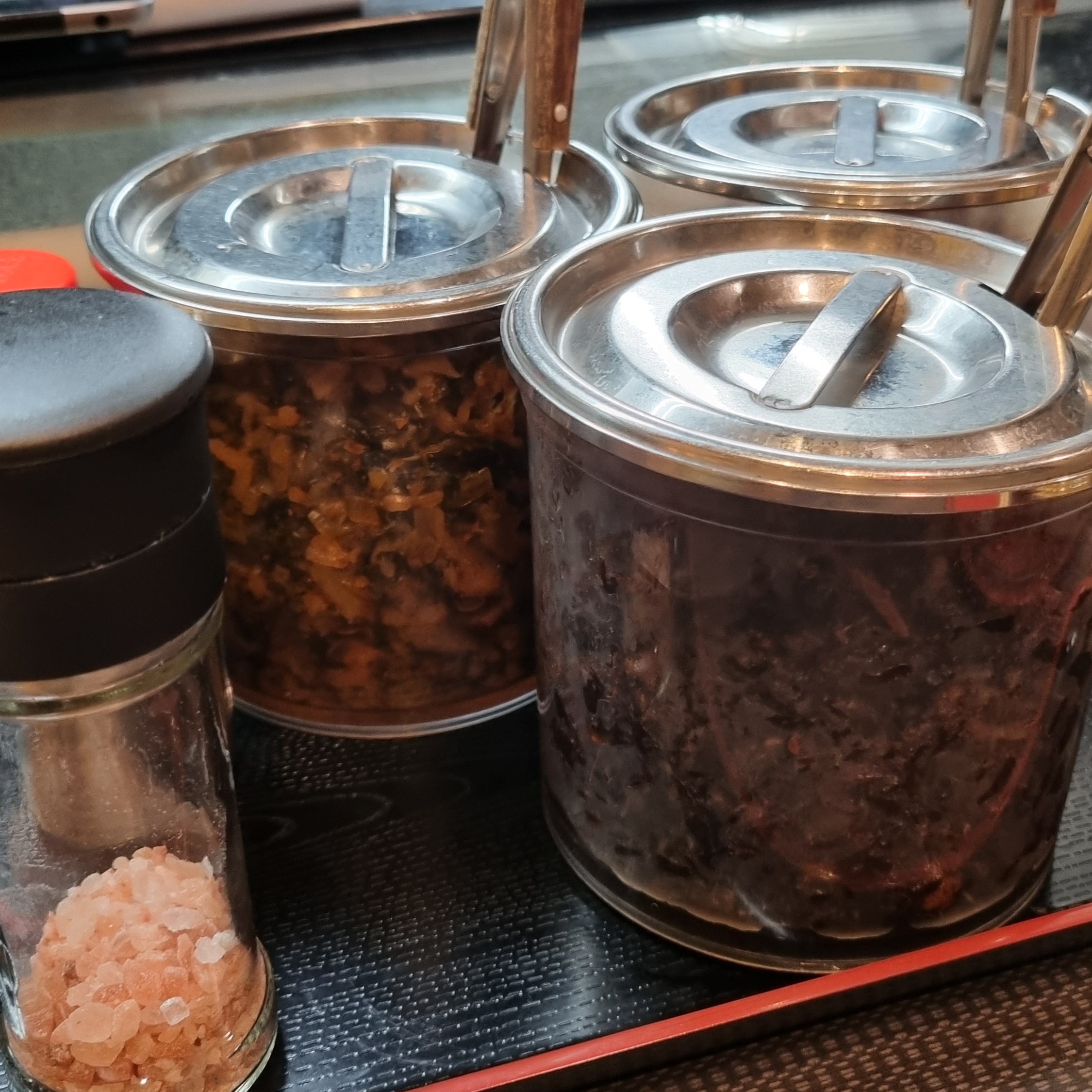튀김 정식을 주문하면 된장국과 밥이 함께 나오고 게다가 수제 츠케모노를 마음껏 먹을 수 있다.
